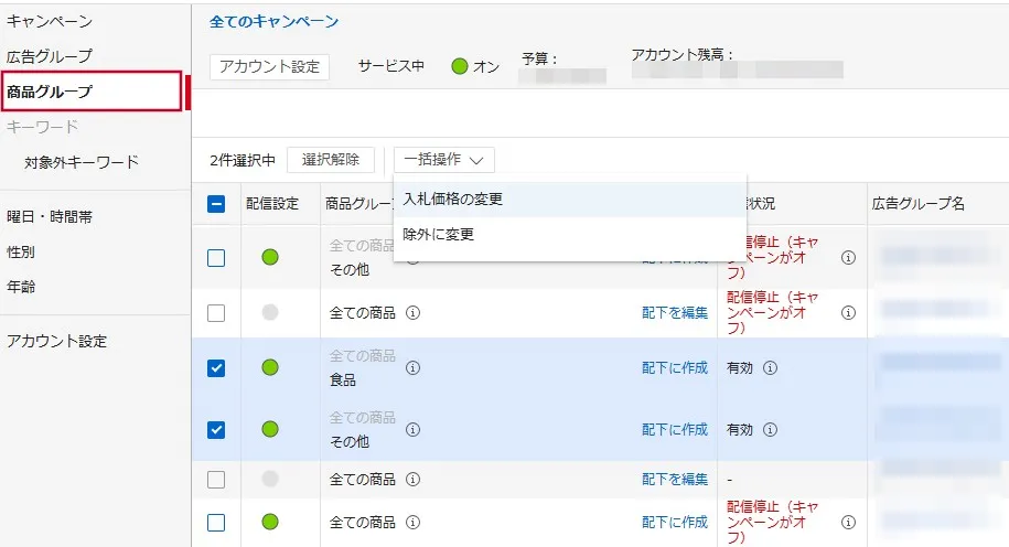 You can perform bulk operations such as specifying bids and delivery settings directly from the product groups view.