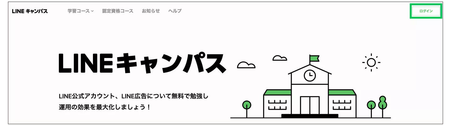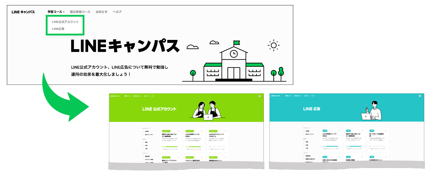 - ・LINEキャンパスTOPページに表示される、「LINE公式アカウント」か「LINE広告」のバナーをクリックし、任意のコースを選択します。