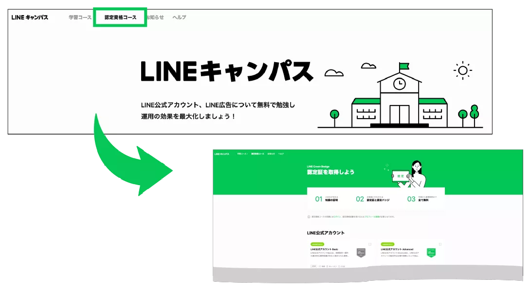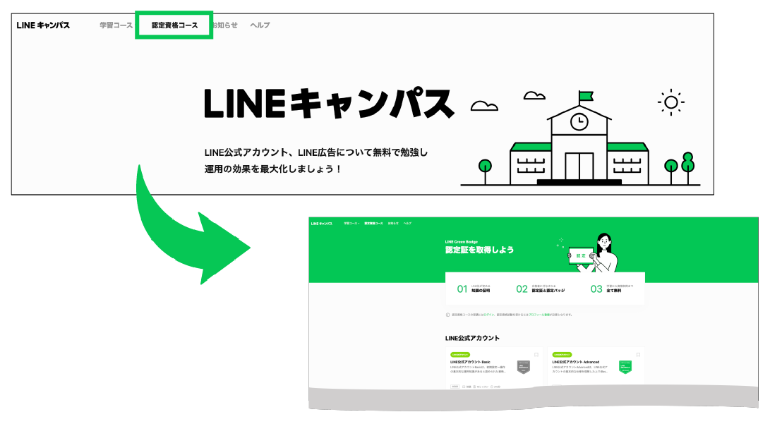 - ・LINEキャンパスのページ上部にある「認定資格コース」を選択し、いずれかの認定試験に合格してください。