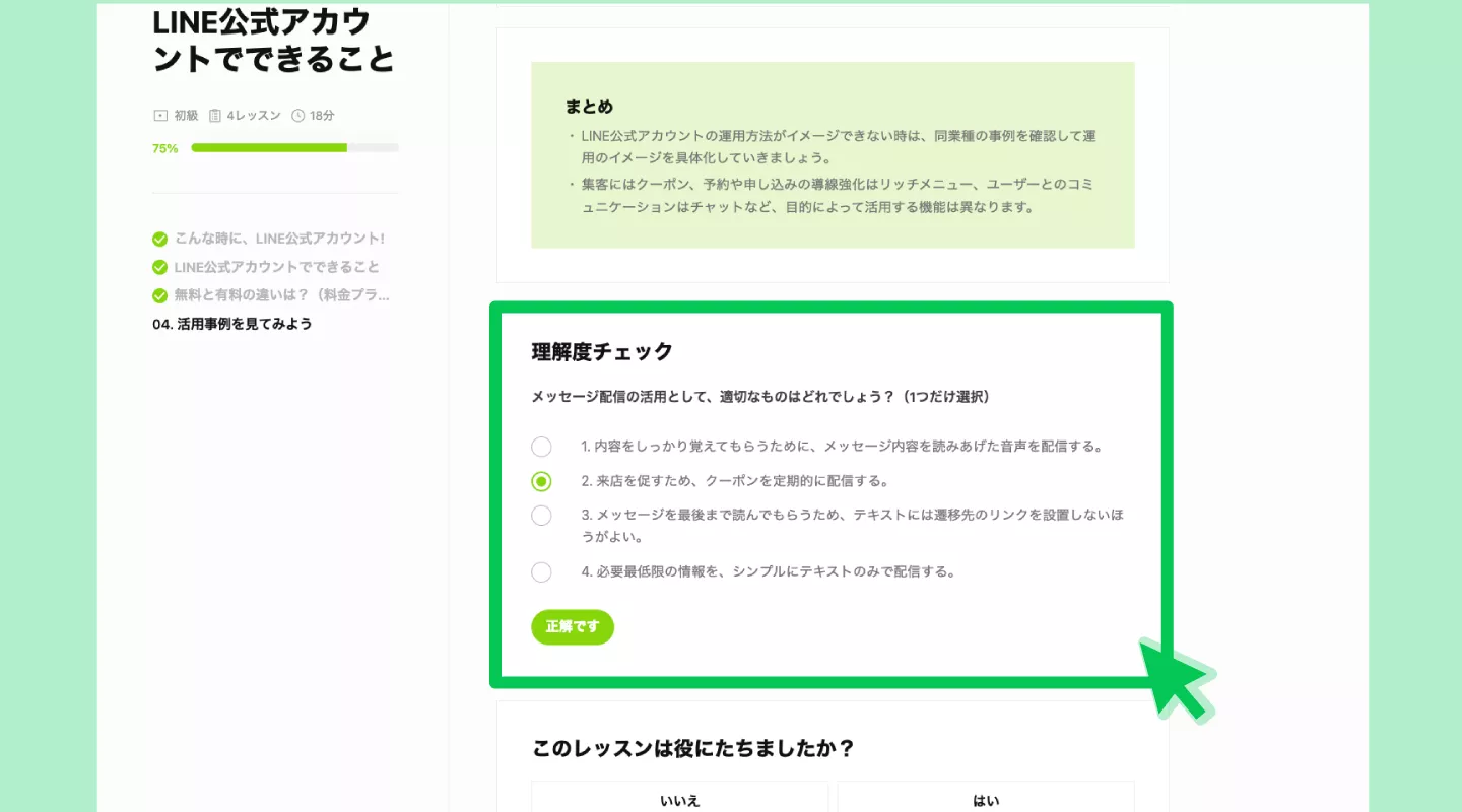 - ・各コースのレッスン末尾にある「理解度チェック」に回答することで受講が完了します。