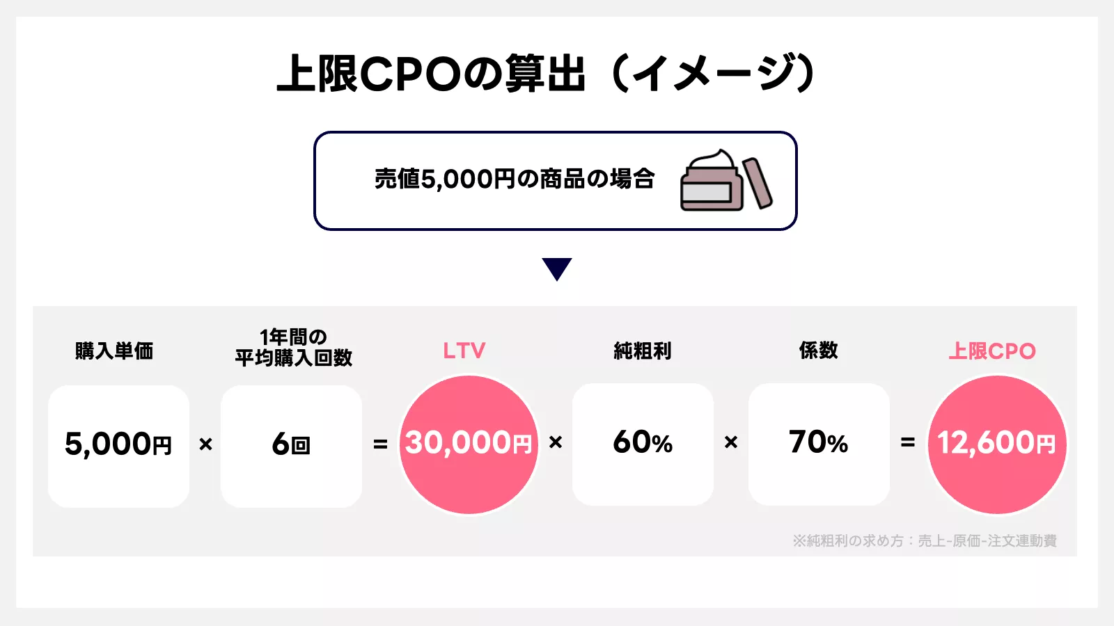 同社では、商品ごと、広告媒体ごとに、「顧客1人あたりの1年後の平均売上はどのくらいになるか」をデータ化しています。そこから商品の原価と、商品の発送に伴うコスト、そして社の利益を差し引いた額を「上限CPO」として設定しています。
