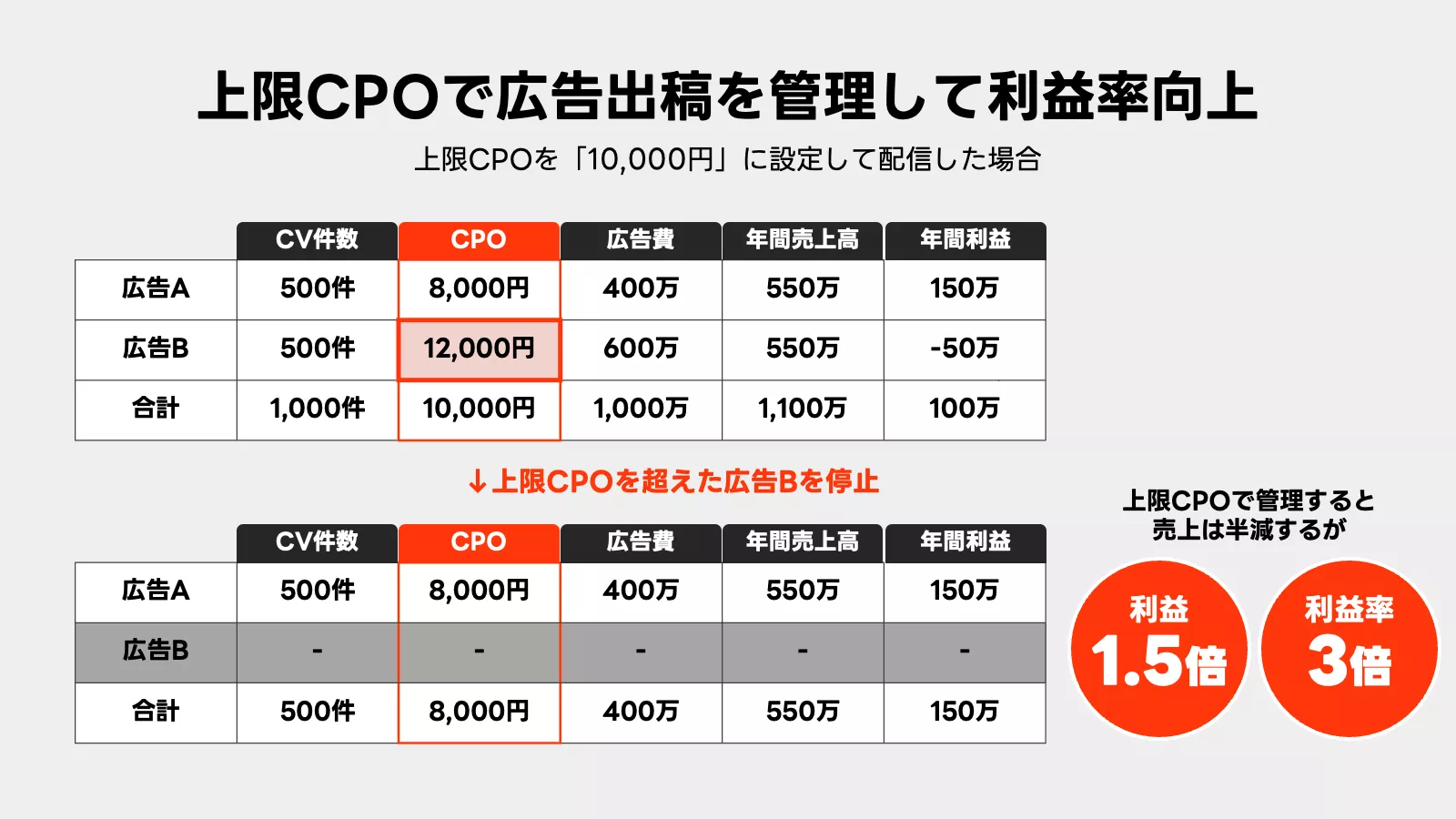 「弊社は収益を伸ばすために、商品ごとの新規集客数を最大限に確保し、そして厳格な利益管理をしながら広告投資を行っていくというマーケティング戦略をとっています。確実に利益が残るように、上限CPOの範囲内で広告投資をしています。売上高ではなく、利益のみを重視した運用ノウハウが『上限CPO』なのです」