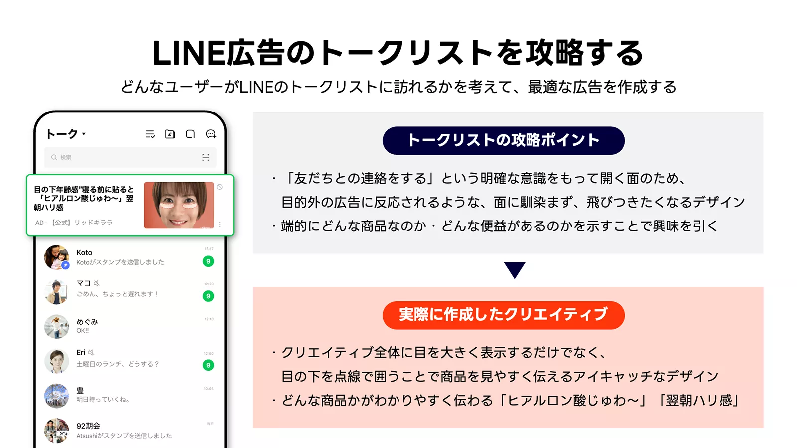 「LINEは、訪れるユーザー数が最も多い『トークリスト』をどう攻略するかがとても大切だと思っています。トークリストを訪れるユーザーは、『友人と連絡を取ろう』といった、明確な目的意識を持って見に来ています。そんなユーザーでも、思わず見てしまう、思わずクリックしてしまう、思わず欲しくなってしまうような〝刺さるクリエイティブ〟を設計していくのが、すごく重要だと分かりました」