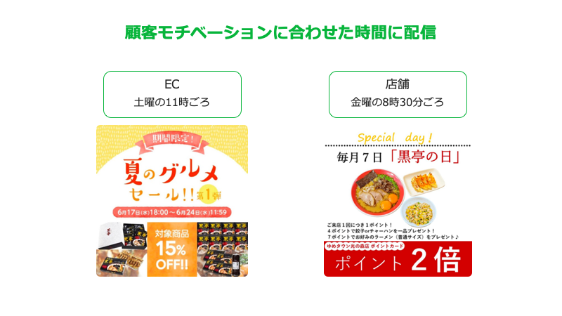 4店舗中で最も新しい店舗である「ゆめタウン光の森店」のアカウントでは、週末の来店を促すため毎週金曜日の午前8時30分にメッセージやクーポンを配信。一方、ECショップのアカウントでは、休日での購買を狙って毎週土曜日の午前11時にメールマガジンと同じタイミングで配信を行います。