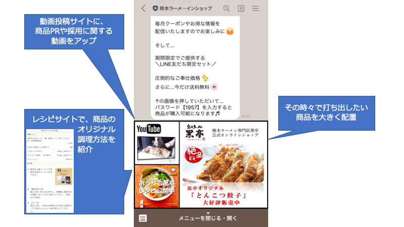黒亭は創業以来、とんこつ風味のラーメンにこだわり、原則、味のバリエーションを増やさず営業を続けてきました。ECショップのLINE公式アカウントでは、主力となるラーメンやサイドメニューを自宅でも楽しんでもらえるよう、リッチメニューを活用してユーザーを各コンテンツに遷移させています。