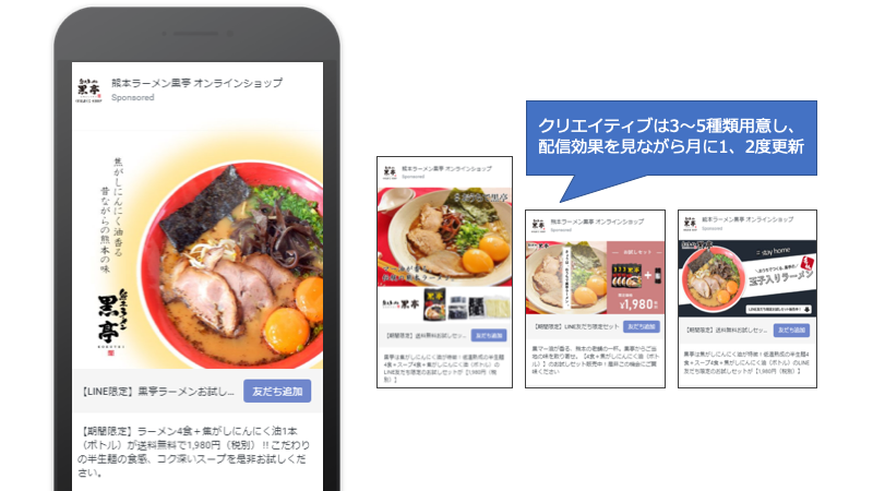 熊本県内に4店舗を展開するラーメン店「黒亭」は、店舗とECショップ別々にLINE公式アカウントを開設して集客や販売促進に活用しています。ユーザーにとってメリットのあるキャンペーン情報やクーポンだけでなく、自社のブランドイメージを効果的に伝えるコンテンツをLINE公式アカウントで配信するほか、LINE広告を活用した友だち獲得施策にも取り組んでいます。LINEの活用について、店舗を運営する有限会社黒亭の代表取締役社長・平林京子さんに話を聞きました。