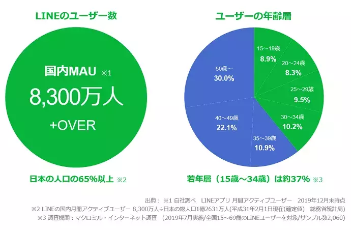 LINEの月間利用者は日本人口の65%以上となる8,300万人。若年層はもちろん、幅広い年齢層に活用されている