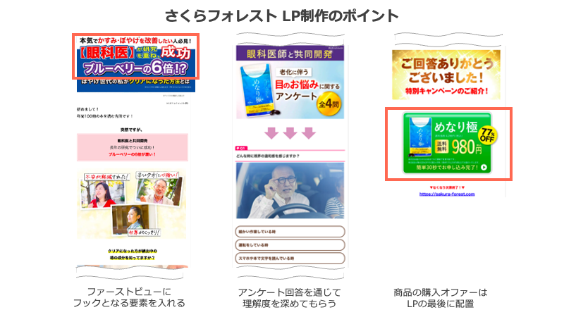 「まず、LPでもっとも目につきやすいファーストビューには、健康食品に対する常識やイメージを覆す“フック”になりうるテキストを入れ、ユーザーの興味・関心を喚起するようにしています。その上でLP内アンケートを入れ、記事や商品に対する理解度を高めてもらうと同時に、購入アクションへと自然に誘導するのもポイントです。