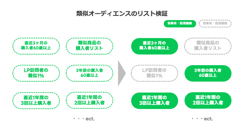 具体的には、自社の保有データを基に、配信に利用する30件超の類似オーディエンス(※)のリストを男女別に作成。その後、短期間の運用で初動の配信効果を検証しながら、効果が低かったリストの配信は停止し、効果が高かったリストの配信は継続するなどしてPDCAを回しています。