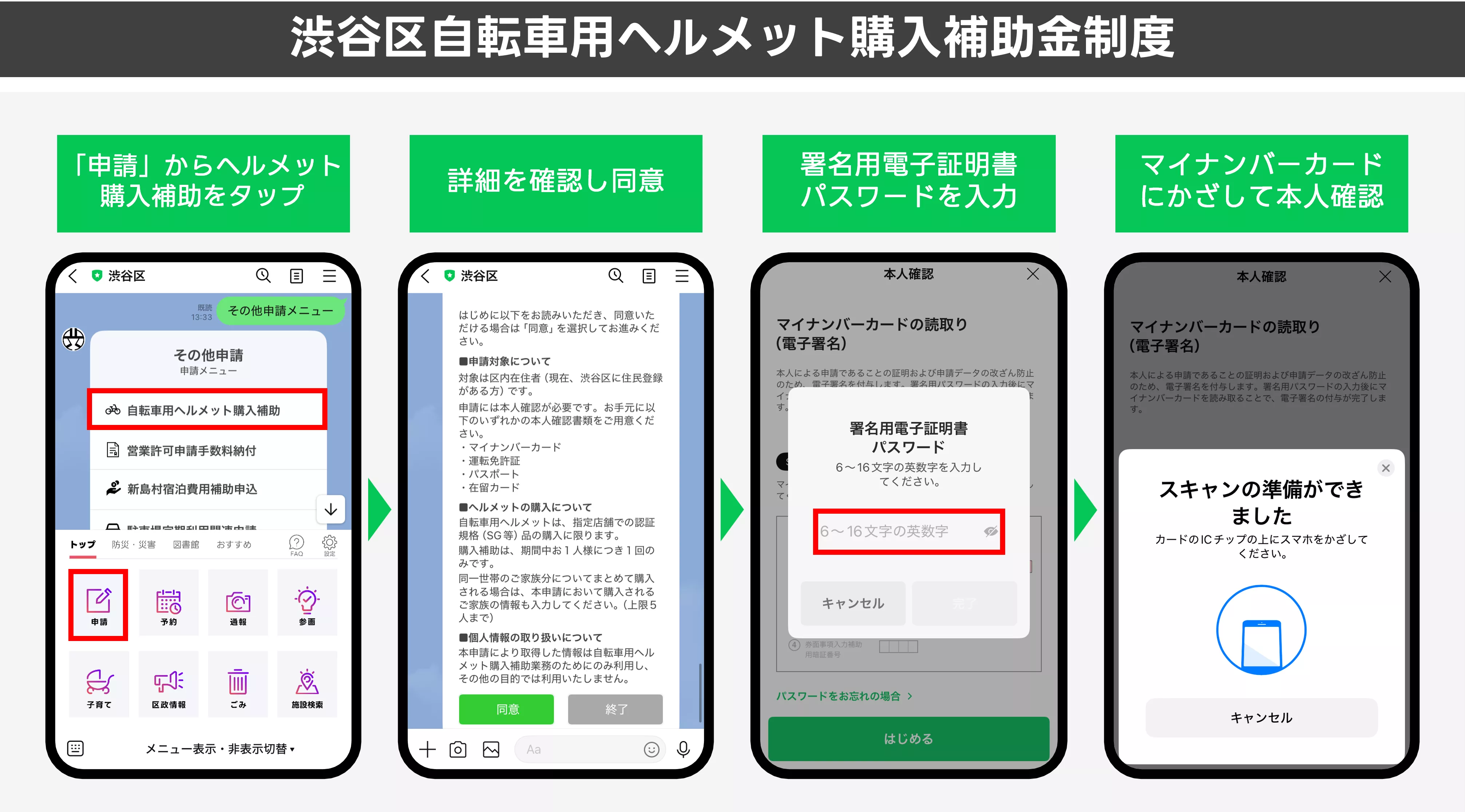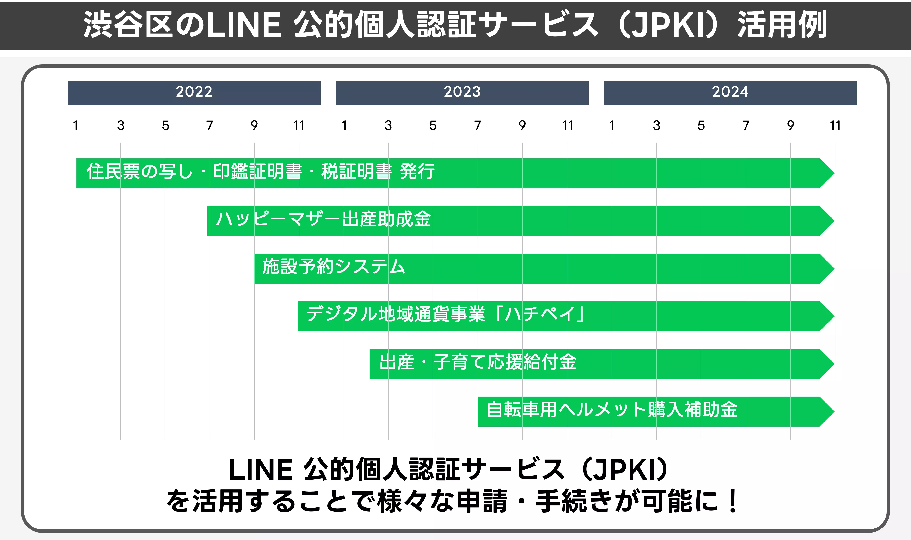 東京都渋谷区では、2022年1月より、住民票の写しや印鑑証明書、税証明書などの手続きをLINE上から申請する際の本人確認手段として、LINE 公的個人認証サービス(JPKI)を取り入れています。