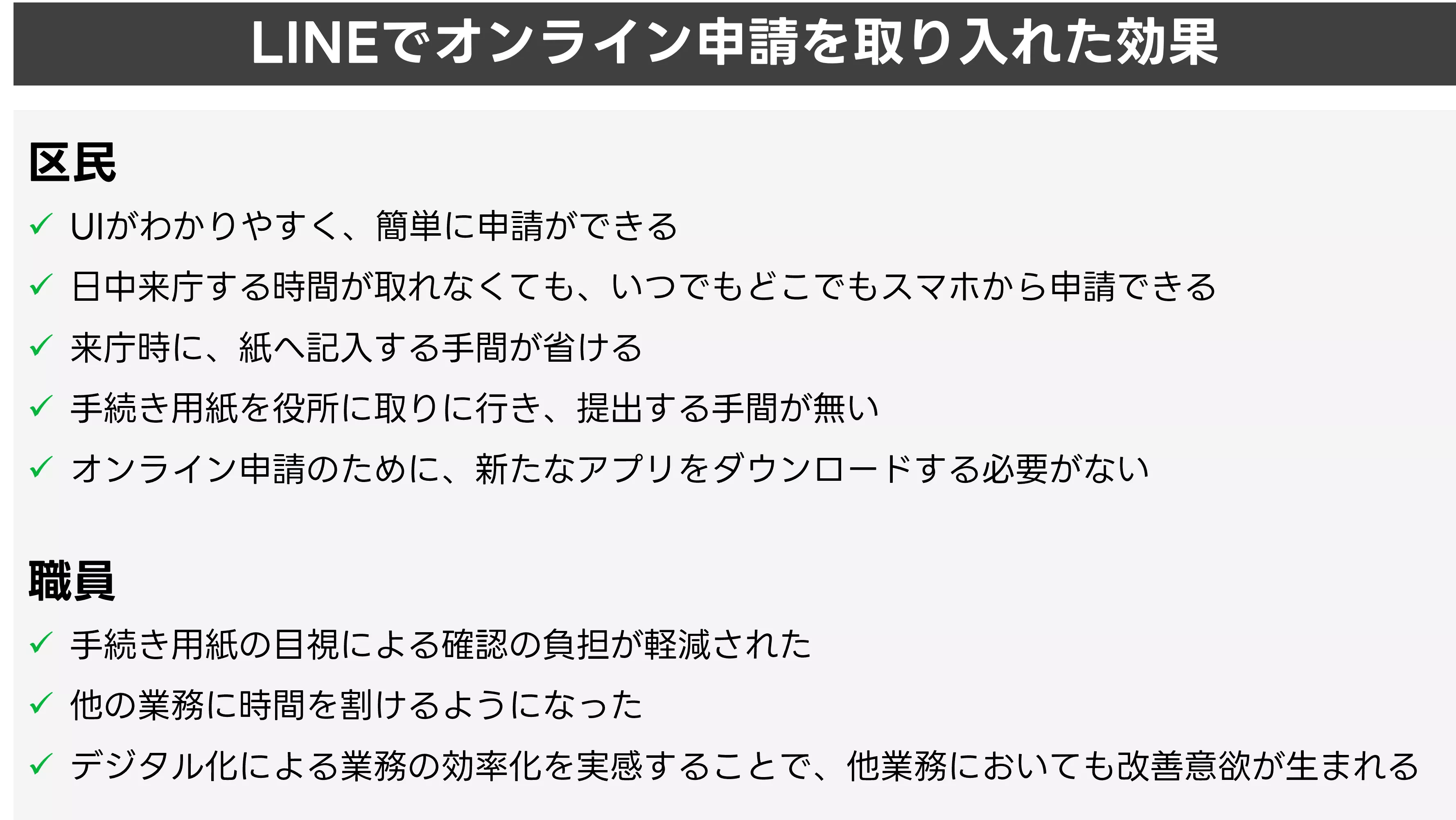LINE 公的個人認証サービス(JPKI)を活用することにより、区民はいつでも、どこでも手軽に申請ができ、行政としても区民の判定をスムーズに行うことができています。