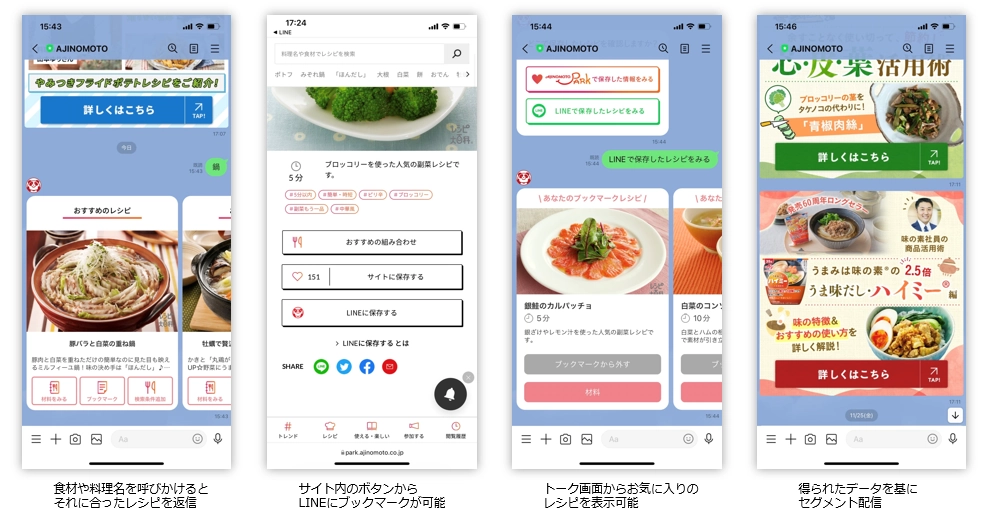 また、「ブックマーク機能」では、「AJINOMOTO PARK」や検索ボットで気になったレシピをLINE内にブックマークとして保存・呼び出しすることができます。