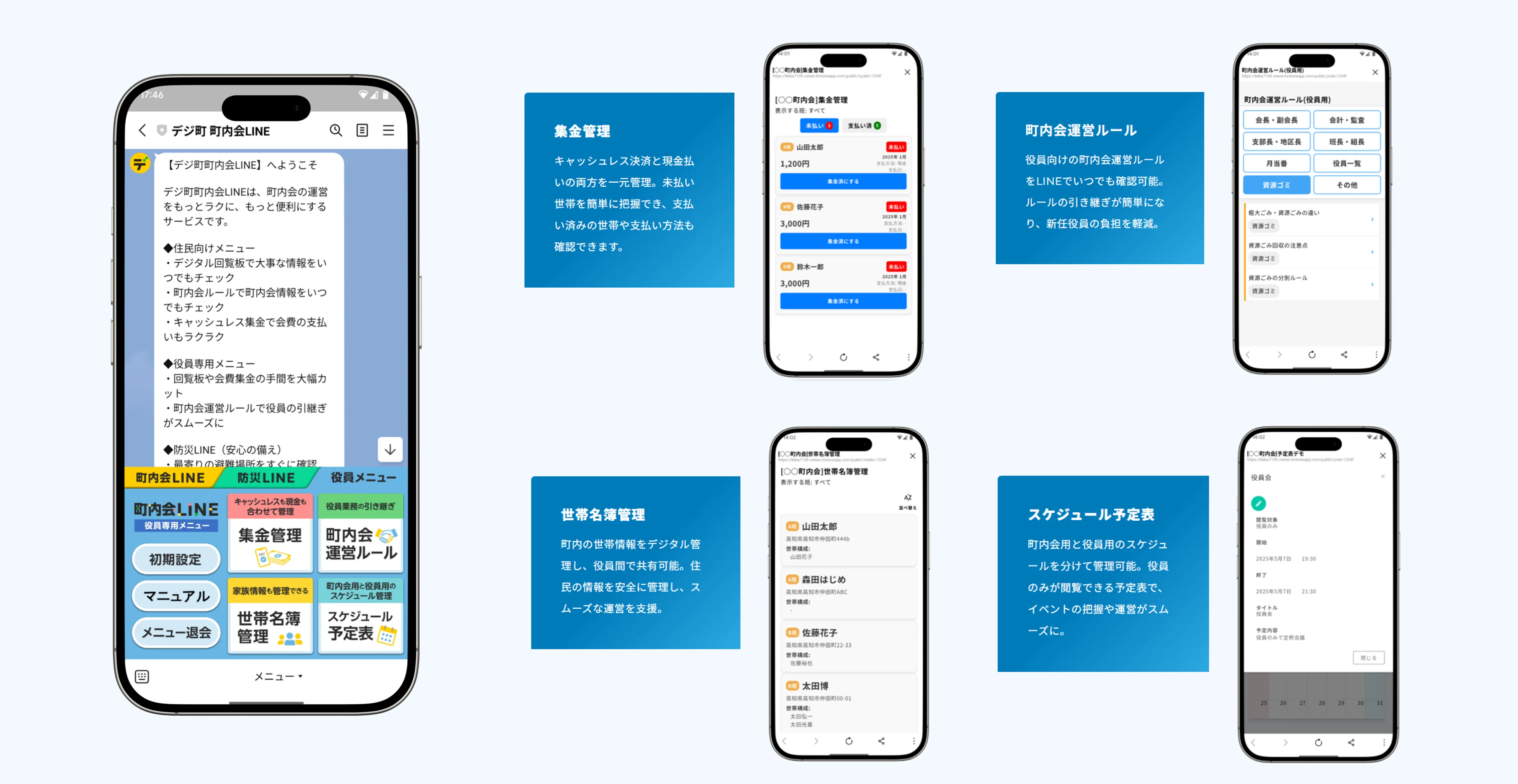 回覧板・防災支援・集金業務・役員引継業務など、従来は紙や対面で行われていた自治会町内会の運営業務を、誰もが使い慣れたLINE上で簡単・安全に実現します。