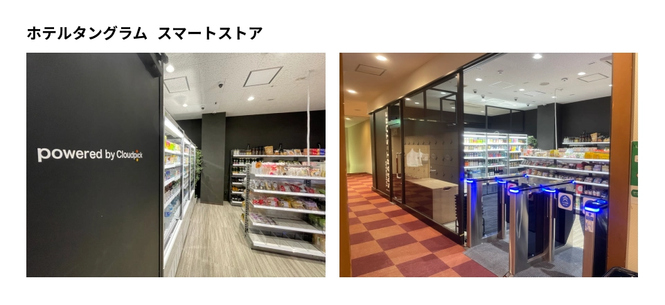 2022年12月、弊社(Cloudpick Japan株式会社)のパートナー企業である株式会社LMCUと共に、東急不動産様のリゾートホテル・ホテルタングラム斑尾に出店をさせて頂いております。以下の画像の通り、店舗運営をデジタル技術で進化させる仕組み(店舗フルデジタル化ソリューション)により、ウォークスルー型無人店舗を実現しています。従来、ホテル内の売店の営業時間中は常時スタッフの配置が必要であったため、20時以降や早朝は、営業時間外にされていました。しかし、スキー場併設型のリゾートホテルということで、「深夜や早朝にも売店を営業したい」という課題をお持ちでした。そこで、ウォークスルー型無人店舗「タングラムスマートストア」を新設頂くことになり、これによって24時間の売店利用が可能となる点やお客様には精算手間のいらない、新しい購買体験が提供できることを期待頂いております。さらに、店舗を省人化により、運営コストの削減、売店業務の生産性向上にも期待頂いております。