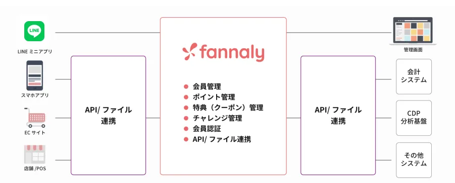 標準機能として、fannaly基盤、LINEミニアプリ、管理画面を提供させていただき、各チャネル、関連システムとの連携が可能になっております。