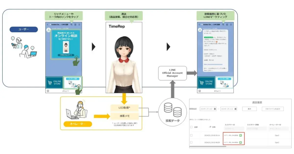 株式会社UsideUが提供する「TimeRep」は、ウェブアプリケーションを介して提供される、アバターを用いた遠隔接客サービスです。TimeRepは、親近感のあるアバターにより、リモートでも対面接客と同等の質の高いレベルで販売・接客を行い、サービス提供を可能にします。これにより、導入企業の「売上向上」、「人手不足の解消」、「コスト削減」、「人材活用」の4つの大きな課題に対応します。LINEとTimeRepを連携することで、LINEミニアプリ (LIFF)を用いたユーザーID(以下、UID)の取得やMessaging APIを用いたメッセージ送信など、LINEアプリ上でオンライン接客を手軽に提供します。LINEを用いることで、セグメント配信によるマーケティング、オンラインでの専門スタッフによる接客、商品購入、アフターケアまでをチャネルを横断することなくワンストップで実現できるようになります。
