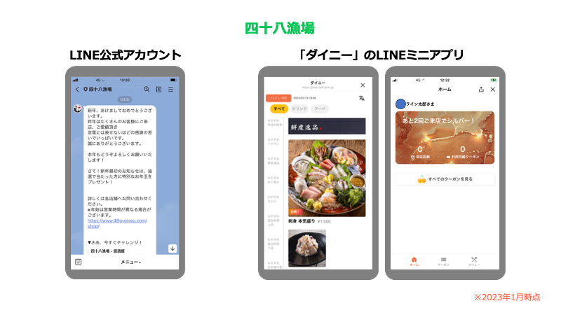 また、リピーター獲得の強化を目指して来店回数に応じたクーポンを配信するなど、LINE公式アカウントの活用にも取り組んでいきます。今年度中に、店舗ごとにLINEミニアプリとLINE公式アカウントを準備して店舗限定クーポンを企画するなど、各店の裁量でそれぞれの特色が出せるよう運用体制を整える予定です。四十八漁場の強みを生かしながら、これからもLINEを積極的に活用していきます」