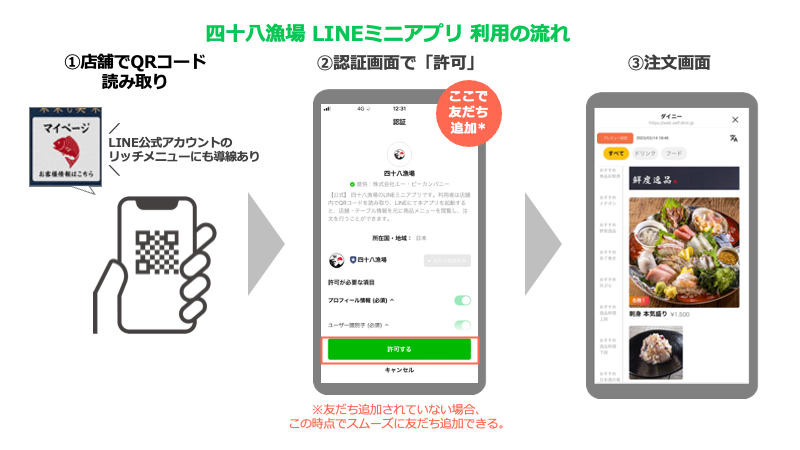 四十八漁場では、既存のPOSシステムと連携することなくダイニーのLINEミニアプリを利用しています。