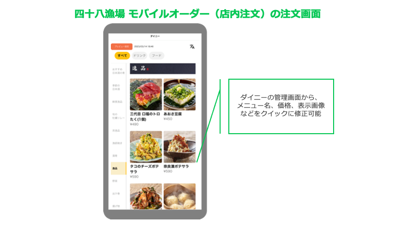 「四十八漁場はもともと対面接客を重視していて、その日に入荷した鮮魚を木製の丸桶に乗せ、お客さまにプレゼンする“岡持ち”を行なっています。そのため、コロナ禍で浸透し始めたタブレット型のオーダーシステムも、お客さまとのコミュニケーションが取りにくくなるという理由で、最初は導入に消極的でした。