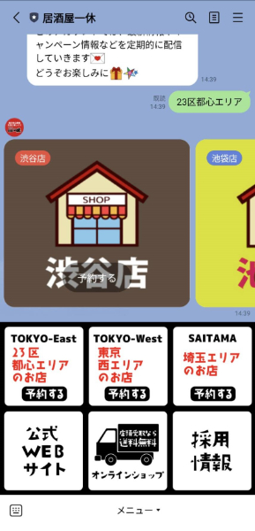 - リッチメニューから、予約したい店舗のエリア(都心・東京西・埼玉エリア)を選択