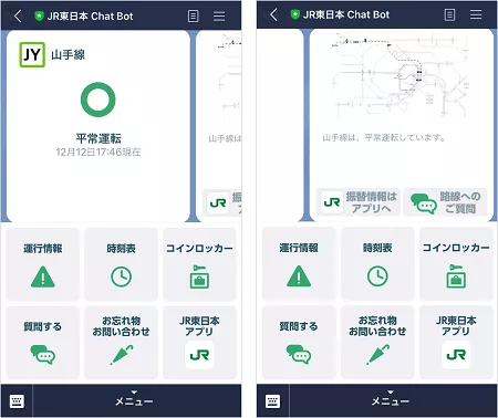 「JR東日本Chat Bot」を開くと、まず目に入るのがリッチメニューに表示される「運行情報」「時刻表」「コインロッカー」「お忘れ物お問い合わせ」「質問する」「JR東日本アプリ(アプリへ遷移させるリンク)」といった6つのボタンです。中でも「運行情報」は最大4つまで「My路線」として登録でき、登録した路線の情報をリアルタイムで受け取ることができます。