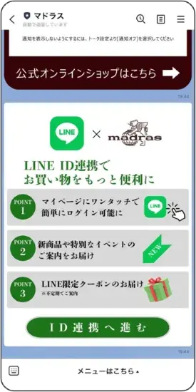 一方で、すでに友だち追加はしているものの、まだ会員登録やID連携が完了していないユーザーも一定数存在します。そうしたユーザーに対して、マドラスではいくつかの導線を重ねて自然に連携へと進める工夫を行っています。