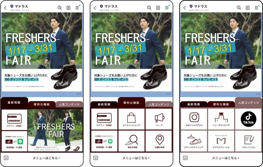友だち追加やID連携の施策と並行して、マドラスが力を入れてきたのが 、LINE公式アカウント上で「迷わず進める体験」を形にすることです。その中心となっているのが、タブ型のリッチメニューです。