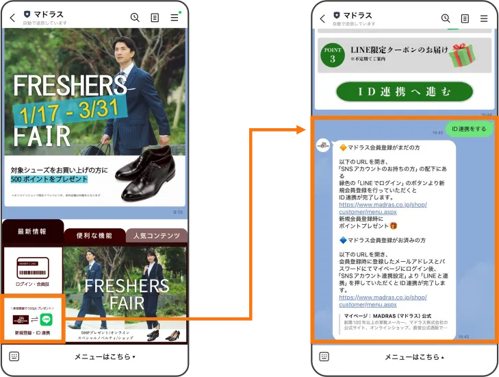 また、リッチメニューと自動応答メッセージを組み合わせているのも特徴です。「会員登録/ID連携」のボタンをタップすると、テキストで「ID連携をする」とメッセージが表示。さらに連携の手順をそのままチャット上で案内します。