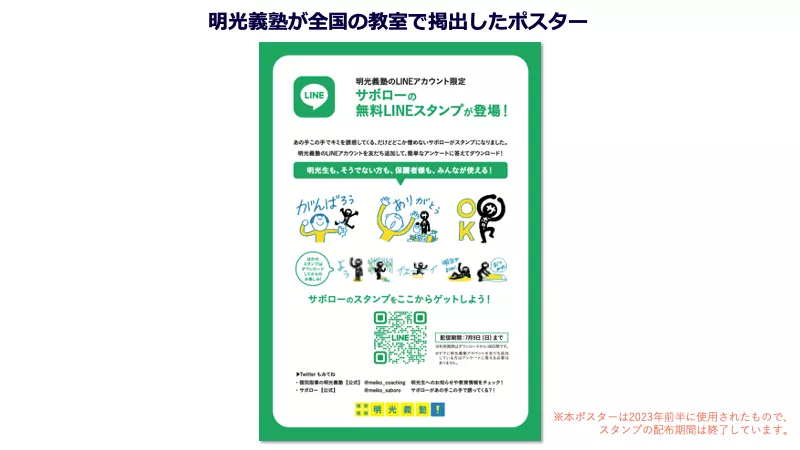 - LINE上で学習塾に関するアンケートに回答すると、明光義塾オリジナルキャラクター「サボロー」のLINEのスタンプをダウンロードできる施策を2023年3〜7月に実施