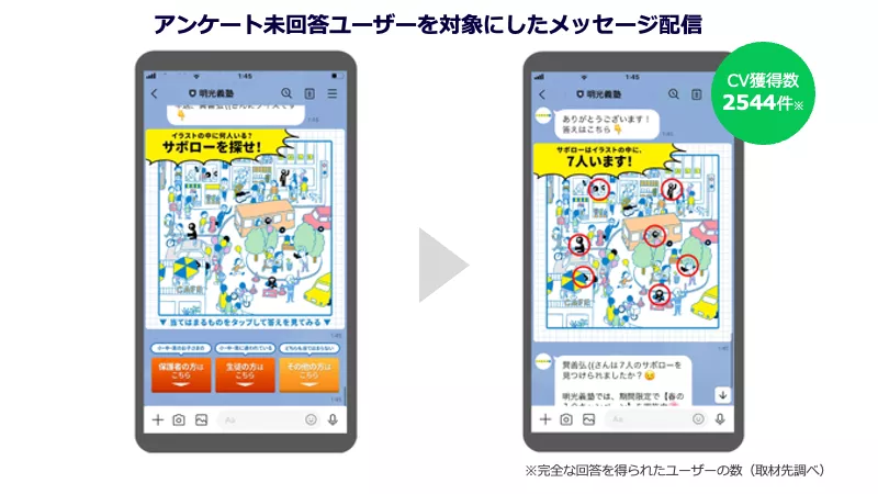 二次拡散で集めたユーザーは先述の学習塾に関するアンケートに回答しなくても『サボロー』のスタンプを入手できる仕様だったため、それらのアンケート未回答ユーザーを対象に、後日、メッセージを配信。その際、クイズ形式のコンテンツを用意してアンケート回答を促すように工夫を加えました。