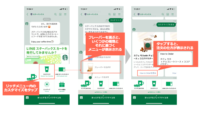 また、「カスタマイズ」は、「今の気分でさがす」「フレーバーでさがす」などの選択肢をタップするだけでユーザーに最適なカスタマイズされたメニューが表示され、注文の方法も表示可能です。
