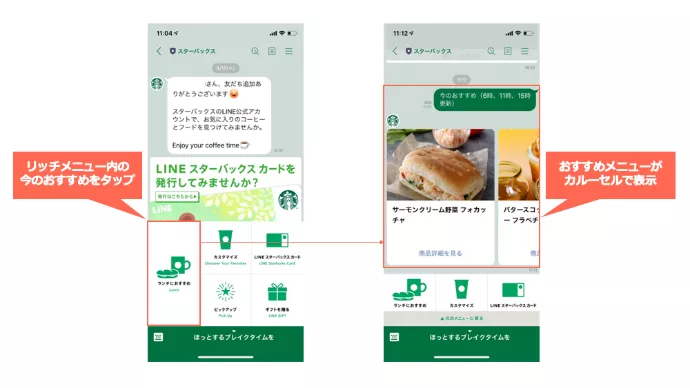 例えば、リッチメニュー内で提供されている「今のおすすめ」では、1日3回、6時と11時と15時に、それぞれの時間帯に適したおすすめメニューをカルーセル機能で案内してくれます。