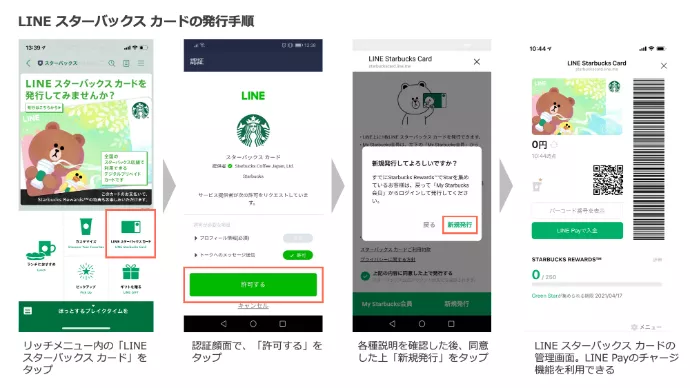 • LINE公式アカウントから発行・管理が可能な「LINE スターバックス カード」をスタート。スターバックスの会員プログラムである「Starbucks Rewards™」への誘導を狙う
