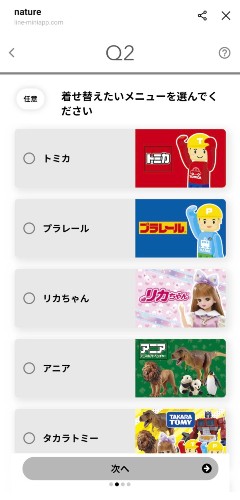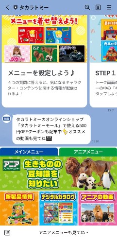 タカラトミーがLINE公式アカウントの運用を開始して取り組んだのが、メッセージ配信やリッチメニューをユーザーに合わせて最適化すること。友だち追加時にユーザーアンケートを実施し、「希望する配信時間」や「興味のあるブランドキャラクター」などに関する設問を用意。アンケートの回答データを元に定期的なメッセージ配信を行っています。