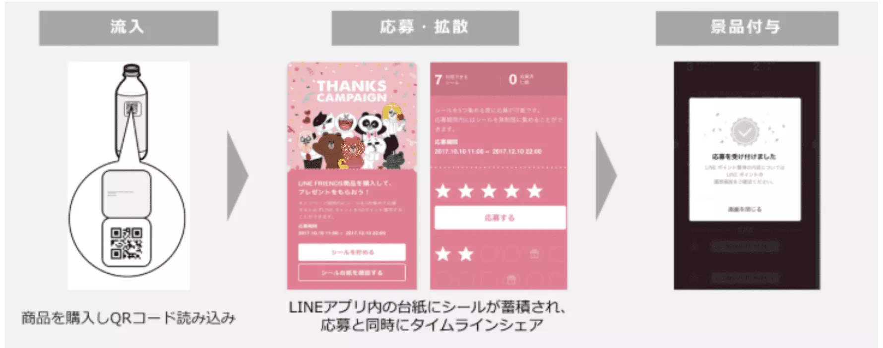 LINEで応募の「LINEマイレージ」とは、店頭購入した対象商品からユニークQRコードを読み取り、LINEで簡単に応募できる複数購買や継続購買の促進に適したキャンペーンプラットフォームのこと。応募時にLINEのタイムライン上でシェアができるため、ユーザー間の口コミ拡散やLINEユーザーに向けたキャンペーンの認知拡大が狙えます。さらに、キャンペーン参加者の識別子を元にした、後追いプロモーションも可能です。