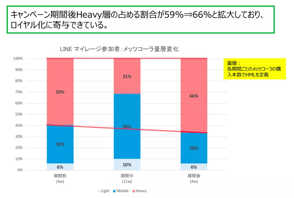 さらに、週に3本以上購入するHeavy層が7%増加し、ユーザーのロイヤル化にも寄与していることが結果に現れました。特に、キャンペーンへ複数回参加した方の購入本数はキャンペーン後も延び幅が大きく、「LINEマイレージ」は残存効果が強いと捉えられています。