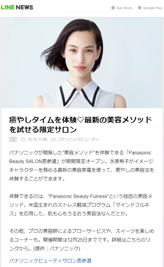 2017年12月、パナソニック株式会社(以下、パナソニック)は期間限定体験型サロン「Panasonic Beauty SALON表参道」をオープン時、集客施策の一つとしてLINE NEWS DIGEST Spotを活用しました。その際にLINE NEWSが告知媒体として選ばれた理由やその広告効果について、パナソニックの山本智子氏(以下、山本氏)と石原久美氏(以下、石原氏)に話を聞きました。