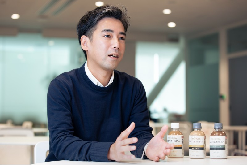 「今の20代から30代前半のユーザーは、学生時代からチェーン店のカフェを利用し、カフェに慣れ親しんでいる世代です。この年代は“コーヒー”ではなく、ミルクを合わせて作る“カフェラテ”を好む傾向があります。当社ではこの層を『カフェネイティブ世代』と呼び、彼らに向けて投入した商品が『ジョージア ラテニスタ』です。メッセージやデザイン、色調もこれまでのRTDコーヒーとは一味違う、シンプルでスタイリッシュな世界観の演出を意識しました」