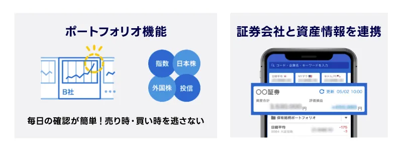 そのほかの特徴として挙げられるのが、情報の網羅性と投資に役立つさまざまな機能。株式のリアルタイム株価、チャート、各種ランキング、経済ニュース、為替レートなど、東京証券取引所をはじめとする27媒体から情報提供を受け、投資に必要な最新情報を網羅しています。さらに、金融資産を管理できるポートフォリオ機能や、証券会社と資産情報を連携できる機能なども展開しています。