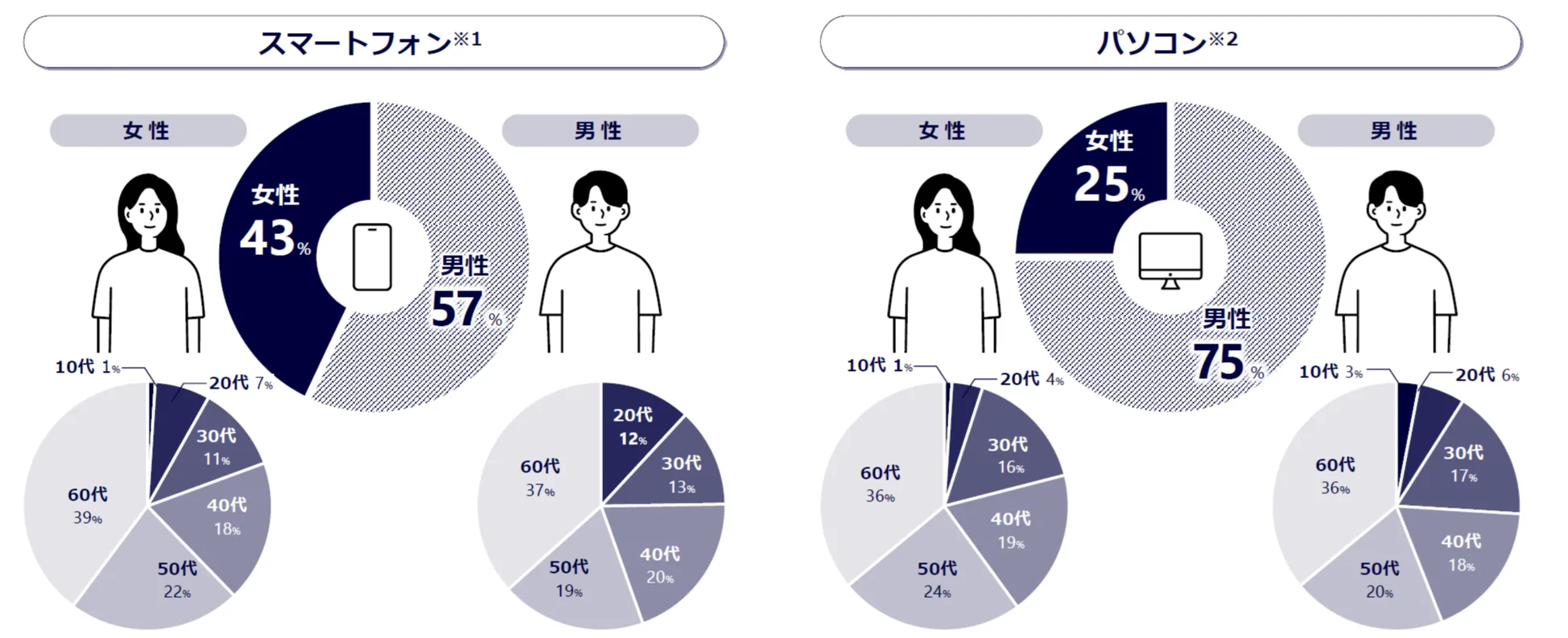 性年代で見ると、金融というジャンルの性質上、メインユーザーは40代以上の男性です。ただし、スマートフォンのユーザーにおいては、男女の割合がほぼ半々となっており、パソコンのユーザーと比較すると女性の割合が高くなっています。