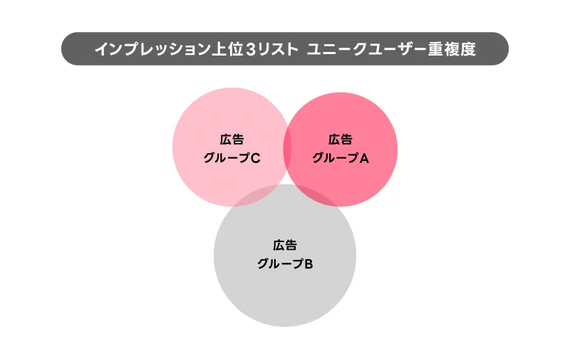 なお、今回作成したリストの中で上位3(A、B、C)のインプレッション数を確認したところ、重複が見られず、それぞれ違うユーザーに対して配信されていることがわかりました。このように、サーチキーワードターゲティングで効果が高かったキーワードをベースに、キーワードを軸ごとにリスト分けすることで、コンバージョン確度の高いユーザーへ配信できていることが良い結果につながっているといえます。