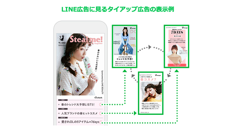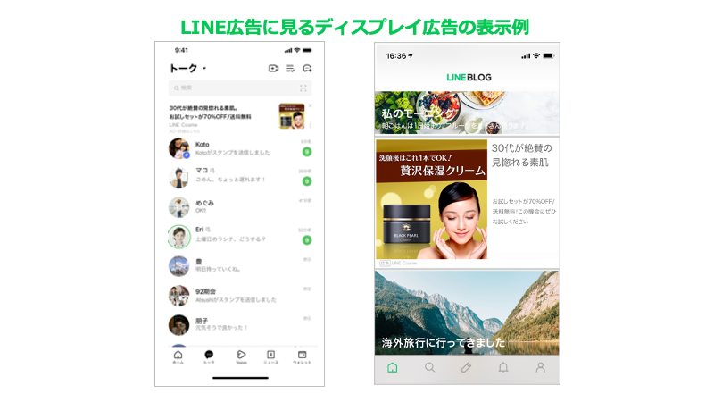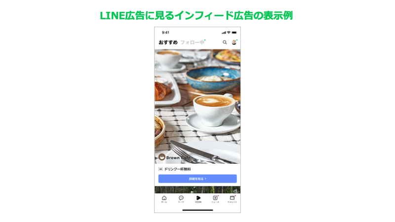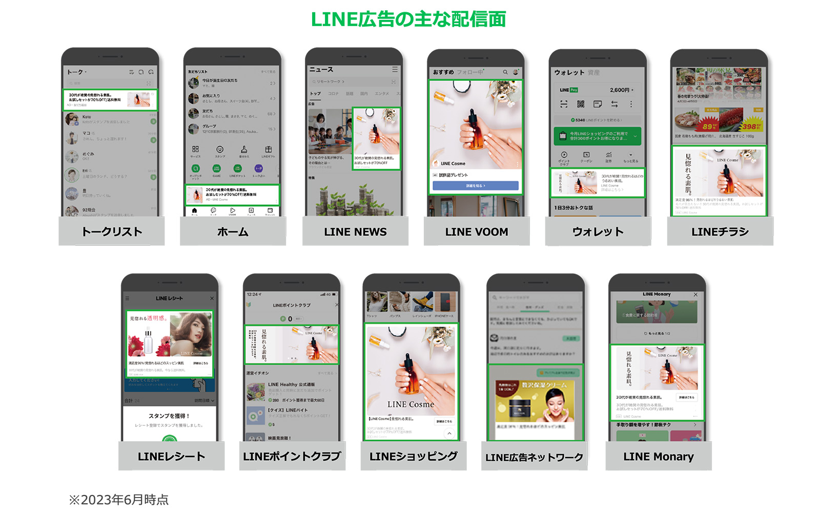 LINE広告は、LINEアプリ内のトークリストやLINE VOOM、LINE NEWS、LINEマンガなど各種ファミリーサービスにも配信されるため、ユーザーのさまざまな利用シーンに合わせたアプローチが可能です。