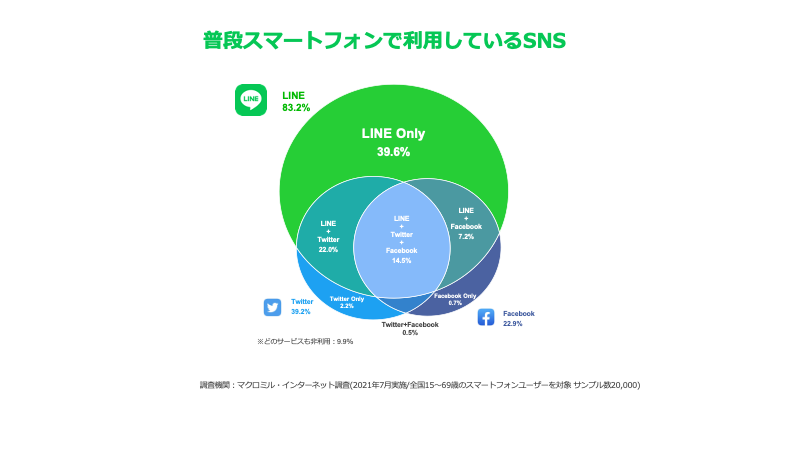 LINEはSNS利用者中82.8%の利用率を誇り、その中でも「ほかのSNSを利用していないがLINEだけは利用している」というユーザーが半数近くを占めています(※)。つまり、「LINE広告でしかリーチできないユーザー」にアプローチできるという大きなメリットがあります。