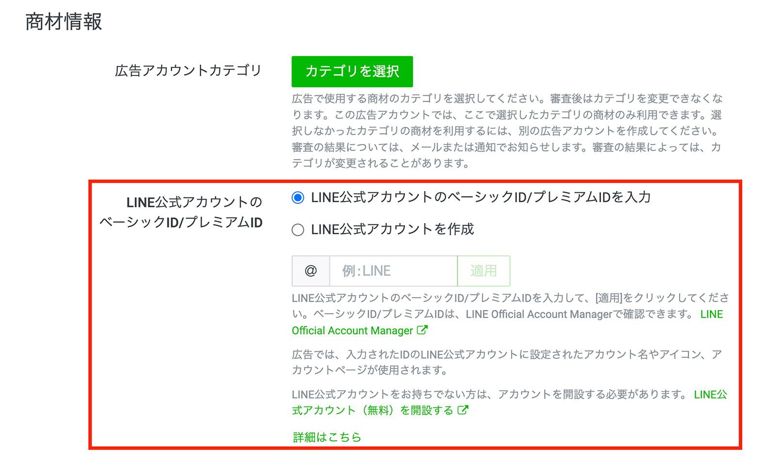 ※広告アカウントの商材情報に設定するベーシックID/プレミアムIDは、認証済アカウントを推奨しています。未認証アカウントでも設定は可能ですが、友だち追加配信など、一部利用できないサービスがあります。詳しくは媒体資料をご確認ください。