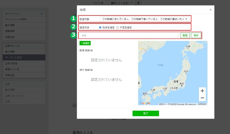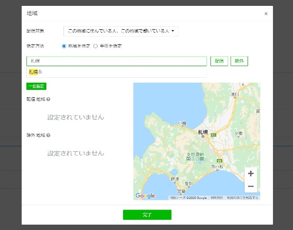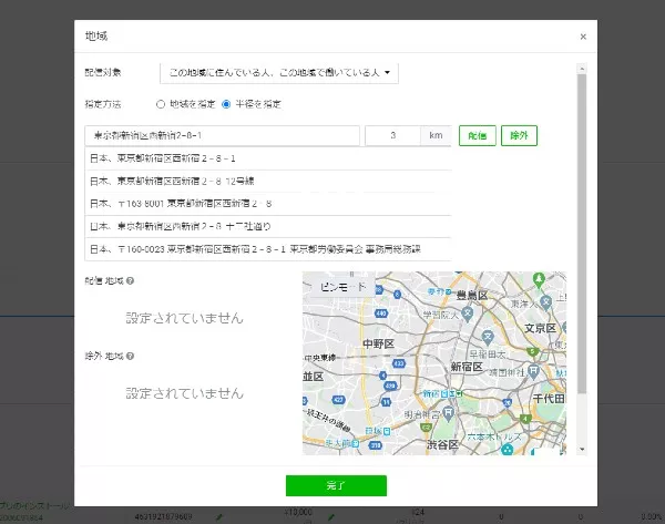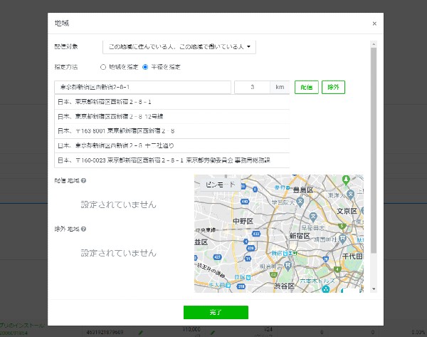 検索ボックスに地域名、住所のいずれかを入力し、正しい候補をクリックして確定させます。その後、半径を指定して「配信」または「除外」を選択します。