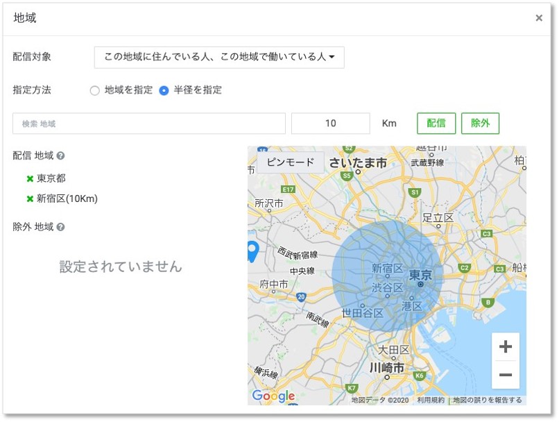 住所検索、ピンで特定の地域を指定し、半径は1km以上から設定可能(2022年6月現在)。配信/除外も設定可能
