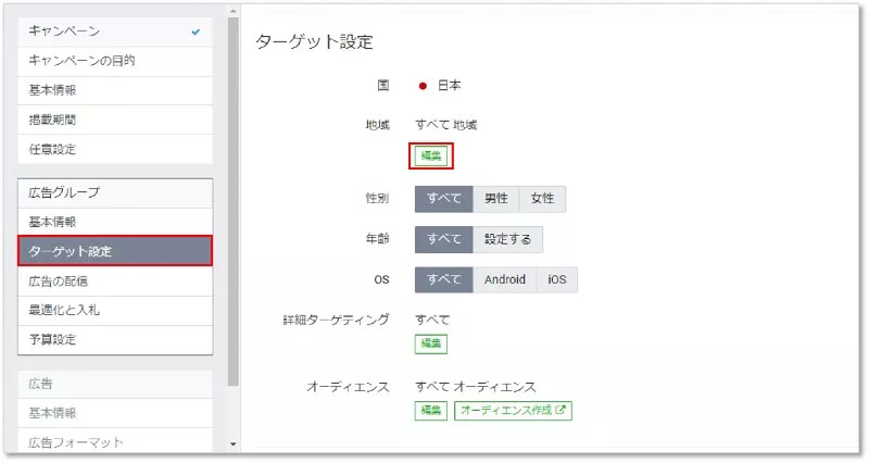 続いて、左メニューの「ターゲット設定」、地域の項目の「編集」をクリックすると、下記「地域セグメント」を設定する画面が表示されます。