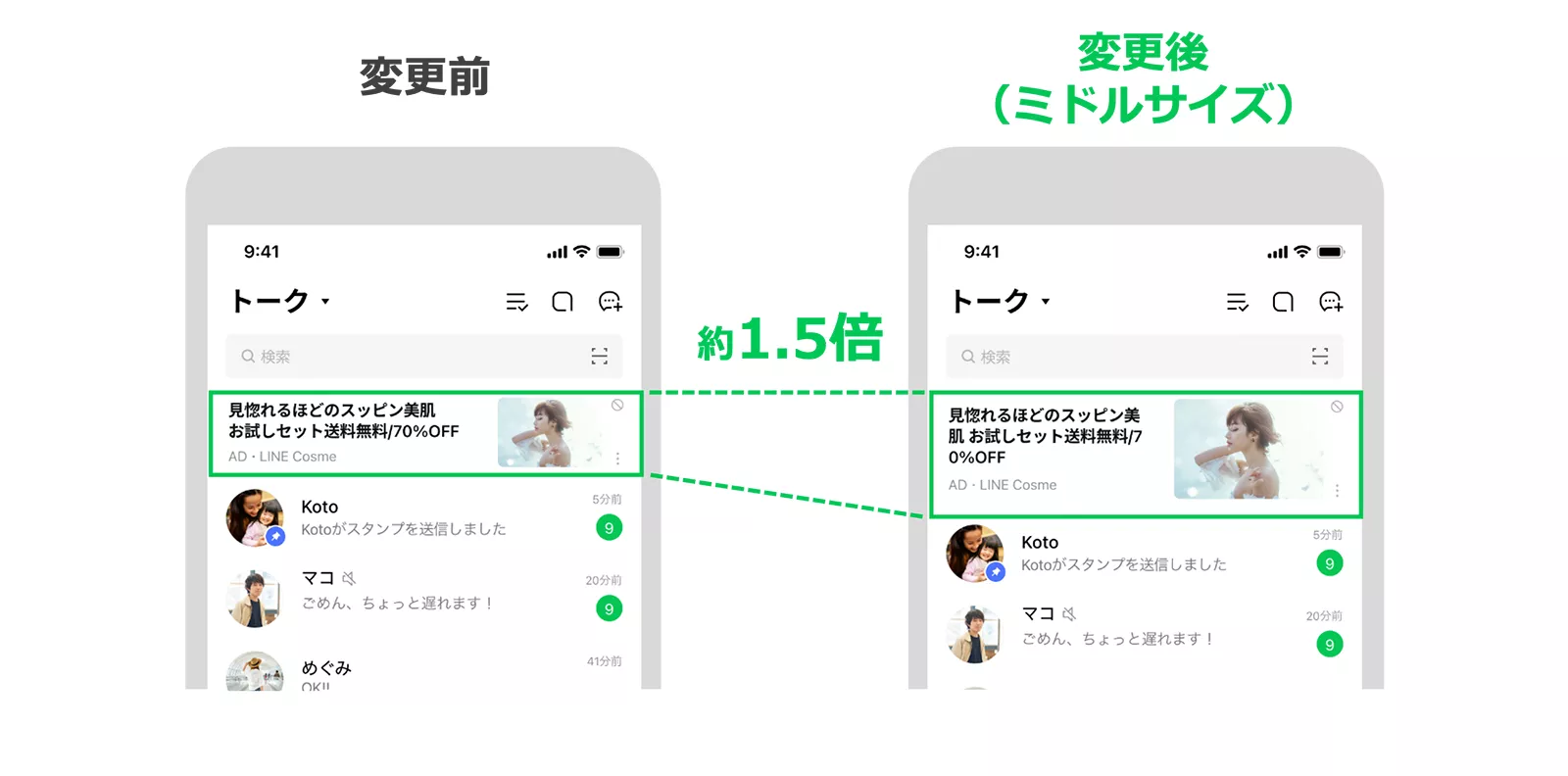 トークリスト面の枠拡大に伴い、LINE 広告/Talk Head View(Talk Head View Custom 含む)においても従来の 1.5 倍の大きさとなるミドルサイズをリリースしました。トークリストの広告表示枠の拡大により、テキストエリアに表示できる文字数も増加しています。