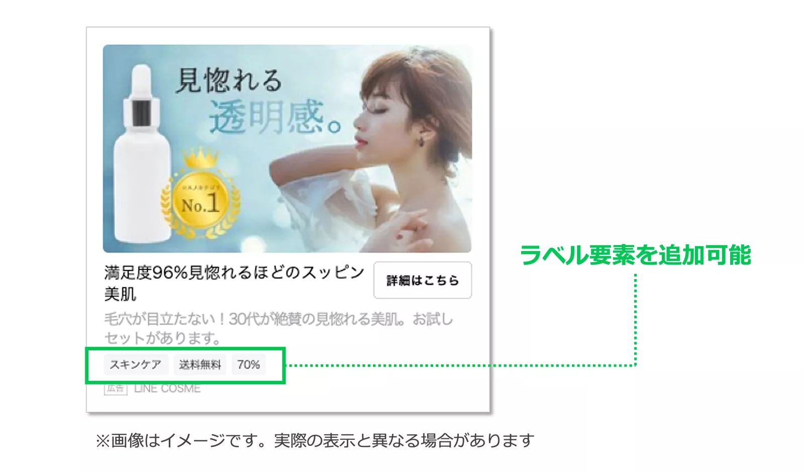 表示される広告に、その商品の特徴を示す「ラベル」要素を追加できるようになりました。適用される配信面はLINE NEWS面で、最大3つまで追加できます。