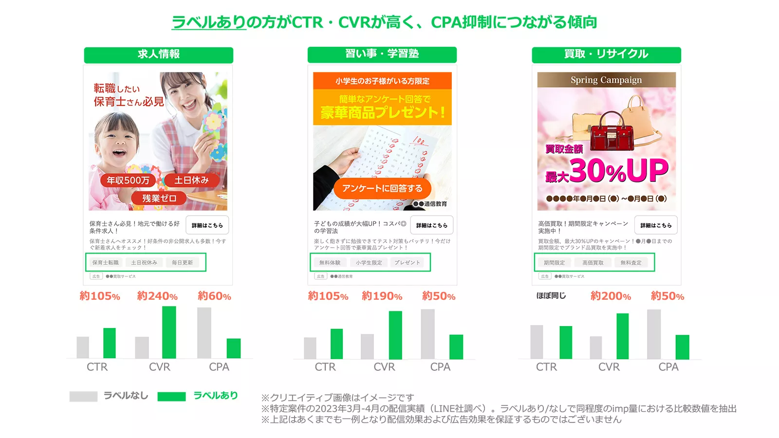 配信事例では、ラベルなしと比較してCTR、CVRが高く、CPAは抑制される傾向が見られました。